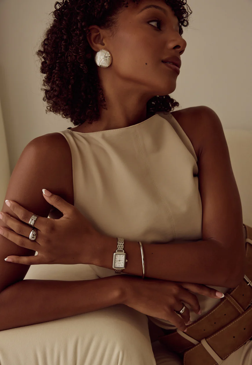 Textured and sculptural, the Bambi Earrings feature an oval-shaped design with curved ribbed lines that wrap across a smooth, domed surface. Crafted from high polish plated stainless steel their dimensional form adds texture to any look.