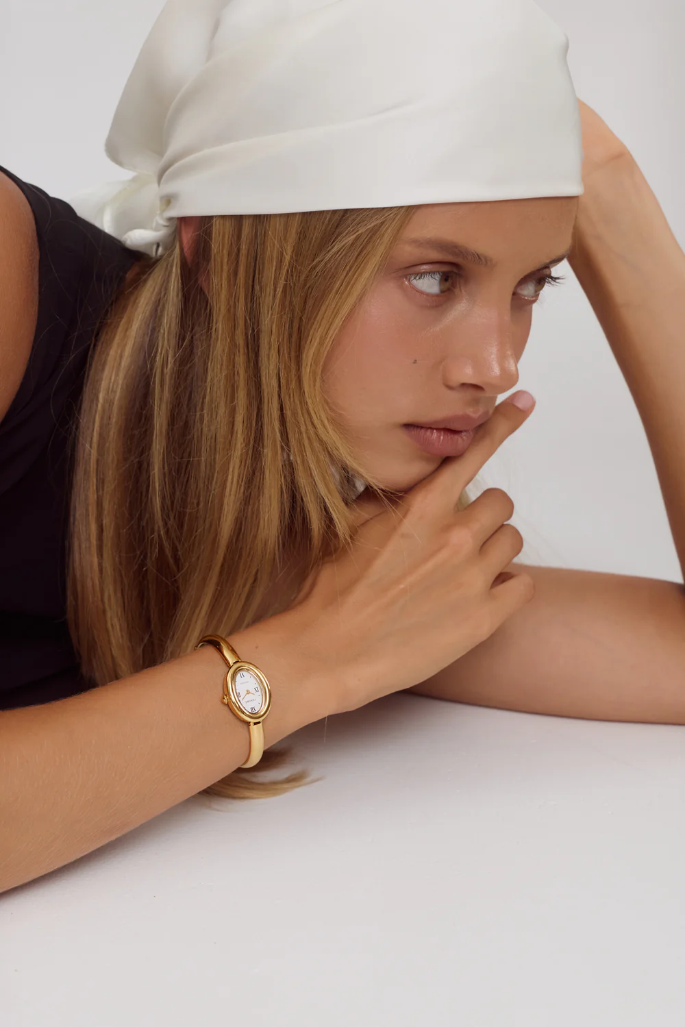 Our first bangle-style timepiece designed to blur the line between jewellery and function. With its minimalist oval face and adjustable bangle, Kate is made to elevate the every day. Available in our signature 18k Gold, 14k Gold, and Silver finishes.