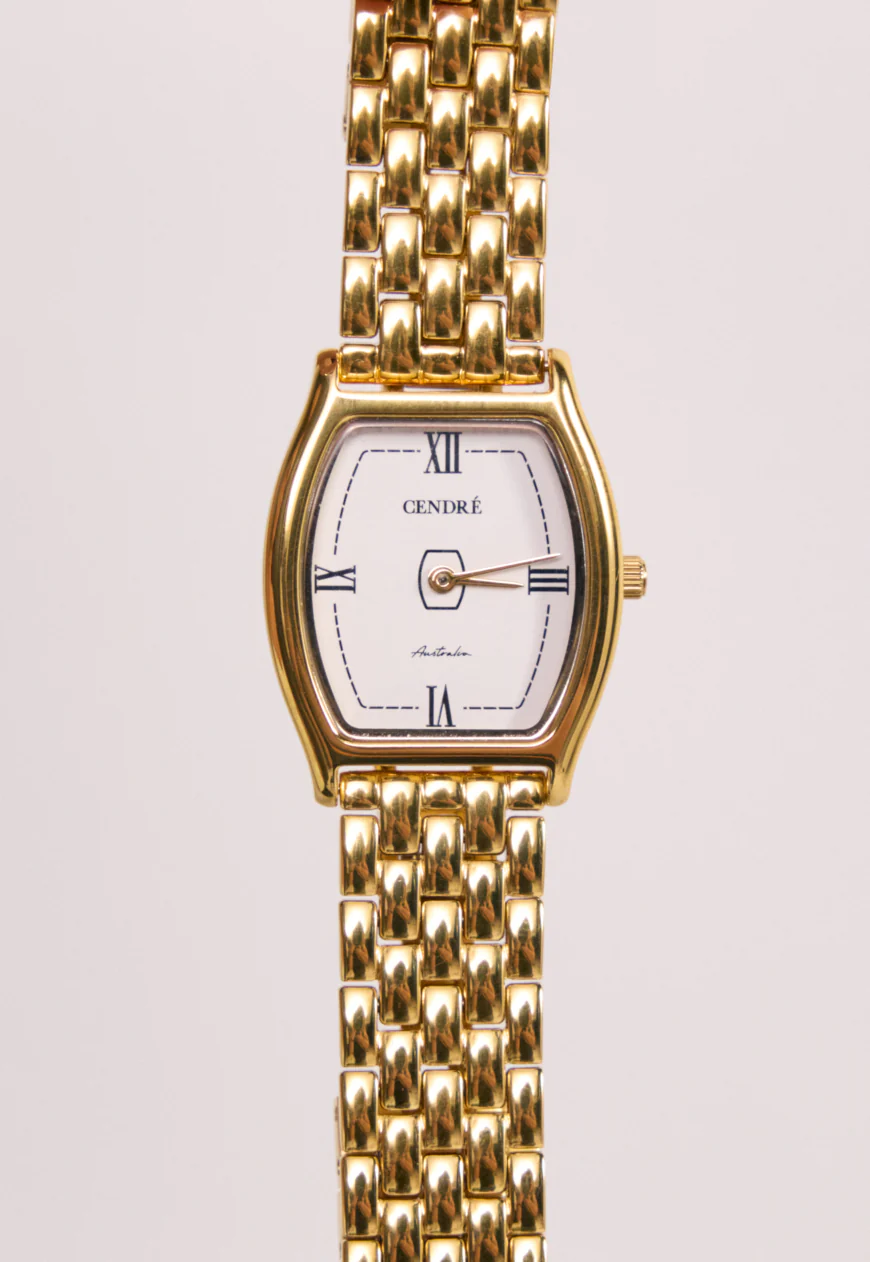 Crafted from 18k premium gold plated stainless steel, featuring a softly curved rectangular silhouette and signature roman numeral dial.