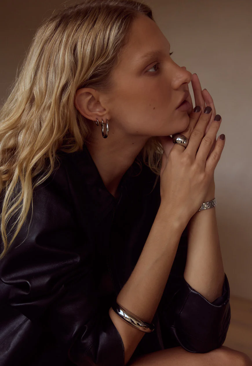 An essential everyday huggie crafted from Premium Stainless Steel. Secures with a click-through fastening, allowing the pair to sit comfortably on the ear without added weight. Wear alone or stack with the Rosie, Rhi, or Rogue Huggies for a layered look.