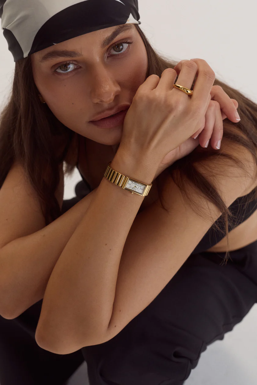 Crafted from 18k premium gold plated stainless steel, featuring a sleek band that feels both classic and modern, paired with a rectangular face and Roman Numeral dial.